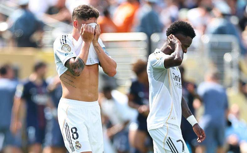 今晨这场4-0,让球迷当然念念起八分之一决赛时的巴黎4-0大捷迈阿密,好多球迷钦慕,皇马今晨踢得还不如迈阿密,因为今晨巴黎在上半场前25分钟就3-0锁定胜局,下半场恩里克的球队照旧滋长威望,但皇马的迫切依旧没什么起色,彻底莫得迈阿密下半场对大巴黎屡屡演出的迫切花样。今晨下半场后20分钟,皇马球员确切灭亡了抵触,主裁判见状,也莫得补时,刚到90分钟就吹响了终场哨。